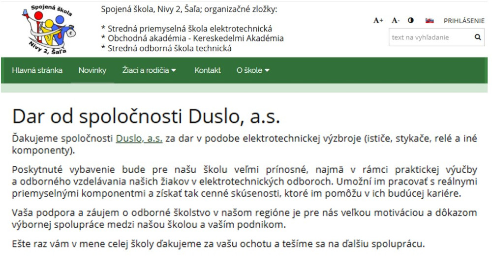 Vaša podpora a záujem o odborné školstvo v našom regióne je pre nás veľkou motiváciou a dôkazom výbornej spolupráce medzi našou školou a vaším podnikom.